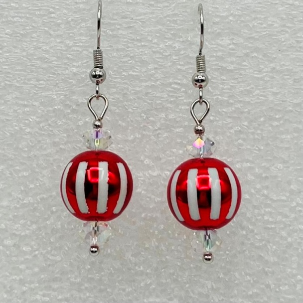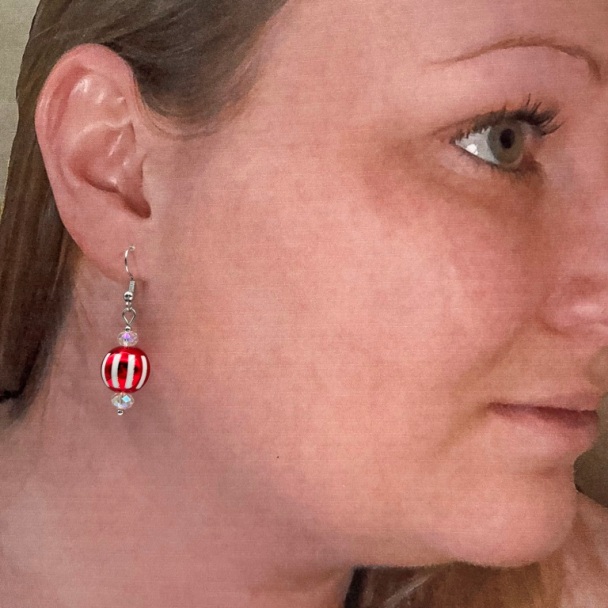 These festive red and white Christmas ball earrings will be perfect for your holiday accessories! The ball measures 12mm, accented with 6mm faceted glass beads hung from silver tone nickel free ear wires. The earrings would go well with this Christmas necklace in my shop: https://simplyrosejewelry.com/jewelry/christmas-balls-dangle-necklace/