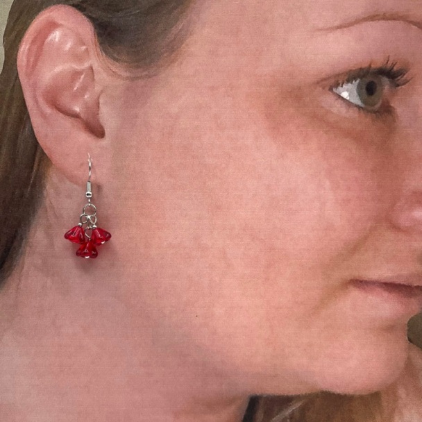 This is a lovely cluster necklace set to welcome spring! Tiny red glass flowers cascade below two green glass leaves. The pendant measures a little over 1.5 inches, including the bail, and is hung on a 20-inch stainless steel chain. The matching earrings are a set of 3 flower clusters hung on nickel free ear wires. This would be a delightful addition to your spring wardrobe!